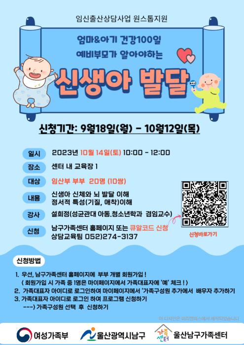 오는 10월 14일에 울산남구가족센터에서 예비 부모를 위한 강좌가 진행된다. 설희정 성균관대학교 겸임교수(참사랑어머니회 울산 부원장)이 예비 부모가 알아야 하는 신생아 발달에 대해서 강의할 예정이다. 신생아의 발달적 특성을 몰라 양육에 어려움을 겪는 경우가 많은데 이러한 어려움을 예방하고자 진행되는 교육 내용이다. 울산 내 거주자라면 누구라도 신청이 가능하다. 울산남구가족센터는 다양한 형태의 가족을 위한 교육 및 프로그램을 제공하는 기관이다.